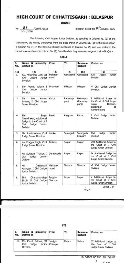 बिलासपुर। छत्तीसगढ़ हाईकोर्ट ने सिविल जज (जूनियर डिविजन) और उच्च न्यायिक सेवा के सदस्यों के ट्रांसफर व पोस्टिंग के आदेश जारी कर दिए हैं। इनमें कुल 10 सिविल जज जूनियर डिविजन और कई उच्च न्यायिक सेवा के अधिकारी शामिल हैं। उद्देश्य न्यायिक कार्यों का सुचारू संचालन और जिलों में भार संतुलन सुनिश्चित करना है।