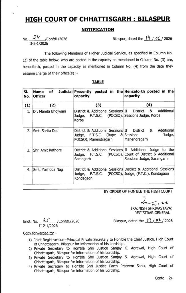 अन्य जजों को बिलासपुर, रायपुर, कोरबा, सरगुजा, धमतरी आदि जिलों में नई तैनाती