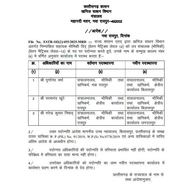 जारी आदेश के अनुसार, पूर्णानंद वर्मा को संचालनालय, भौमिकी तथा खनिकर्म, क्षेत्रीय कार्यालय बिलासपुर में पदस्थ किया गया है। परमानंद खूंटे को संचालनालय, भौमिकी तथा खनिकर्म, क्षेत्रीय कार्यालय बिलासपुर, जबकि नरेंद्र कुमार निषाद को संचालनालय, भौमिकी तथा खनिकर्म, क्षेत्रीय कार्यालय जगदलपुर में नई जिम्मेदारी दी गई है।