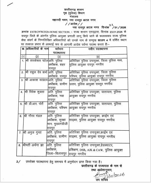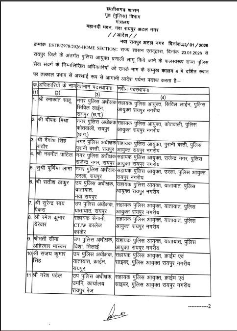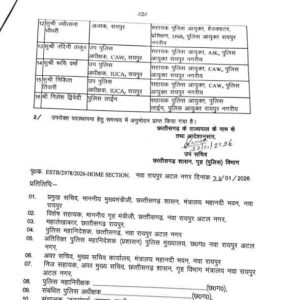 रायपुर। छत्तीसगढ़ शासन ने राजधानी रायपुर में पुलिस कमिश्नरी प्रणाली लागू करने की तैयारी के तहत पुलिस विभाग में बड़ा प्रशासनिक फेरबदल किया है। गृह (पुलिस) विभाग द्वारा ने राज्य पुलिस सेवा संवर्ग 24 अधिकारियों की नई पदस्थापना आदेश जारी की है।